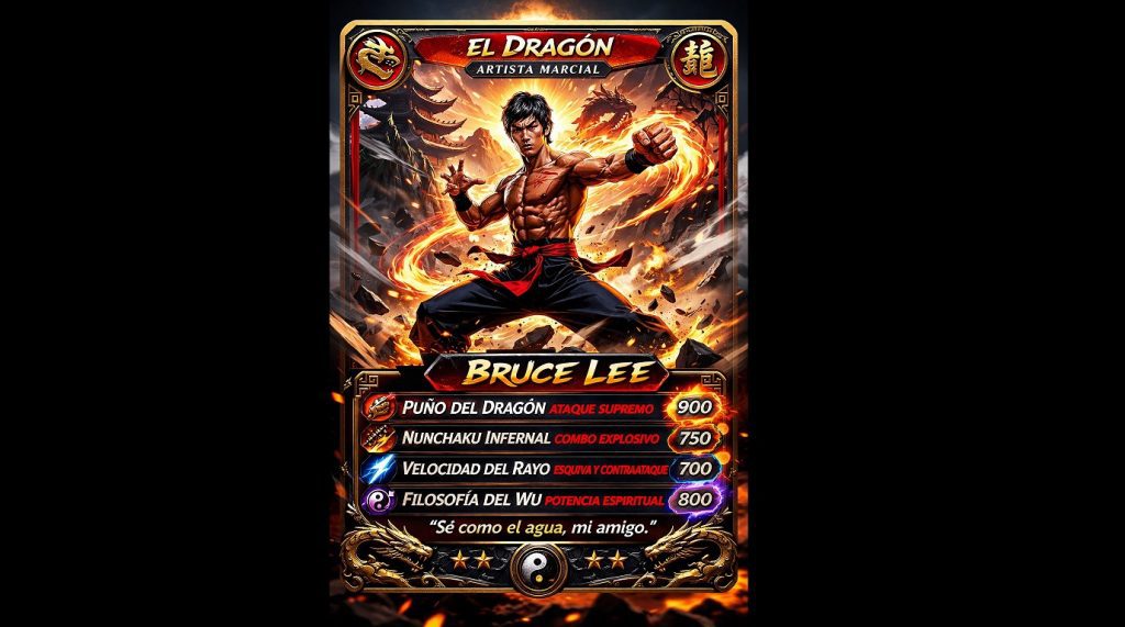 Bruce Lee es una figura que trasciende el cine y las artes marciales. Su imagen se ha convertido en un símbolo cultural asociado a disciplina, velocidad, inteligencia táctica y filosofía de combate. Por eso no sorprende que su legado también haya llegado al mundo de los juegos de mesa y las cartas. En este entorno, en el que la estrategia y la lectura del rival son claves, Bruce Lee encaja como un personaje casi natural. Sus movimientos rápidos, su mentalidad fluida y su estilo impredecible se traducen fácilmente a mecánicas jugables que hacen que cada partida sea dinámica.